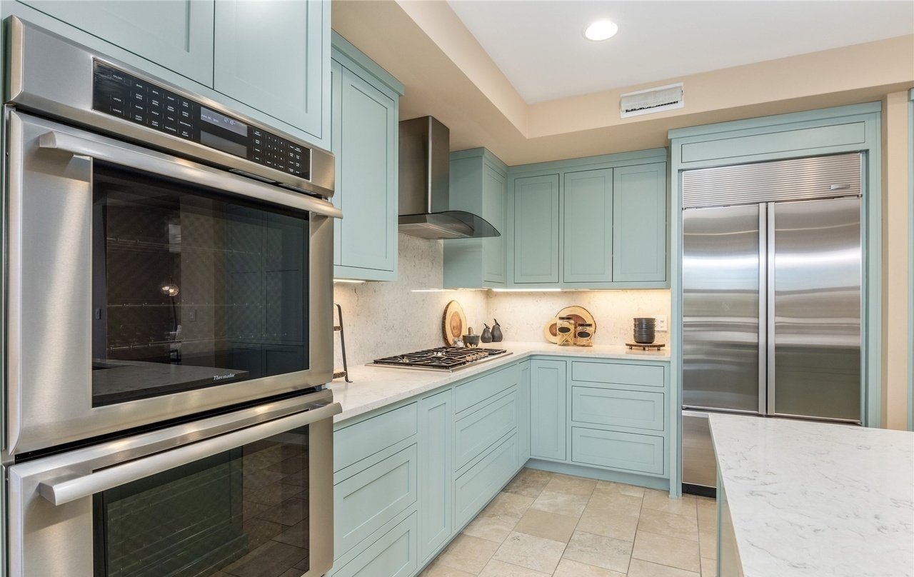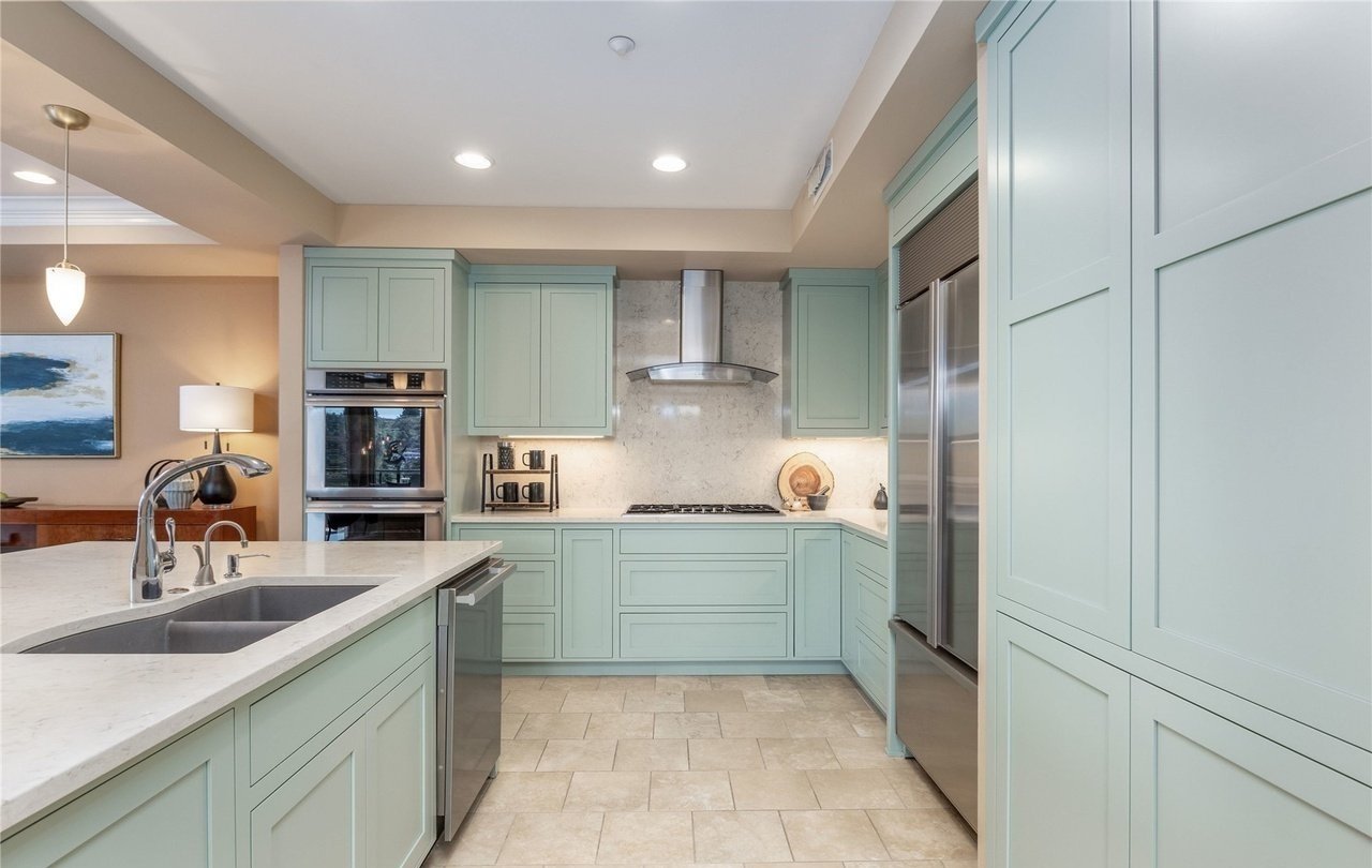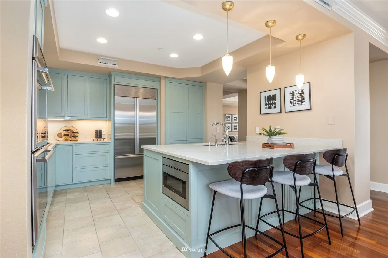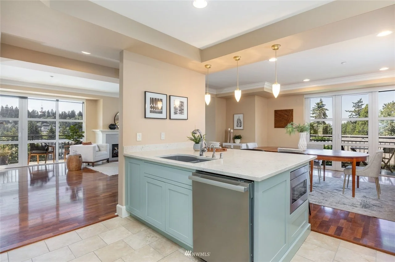 This Bellevue condo’s open floor plan and view of the lake made it the perfect place for a cheerful cabinet paint color. Not only does this kitchen create an effortless and calming aura, it also is super functional with loads of storage, added dining space, and even a popout for a beloved espresso machine.