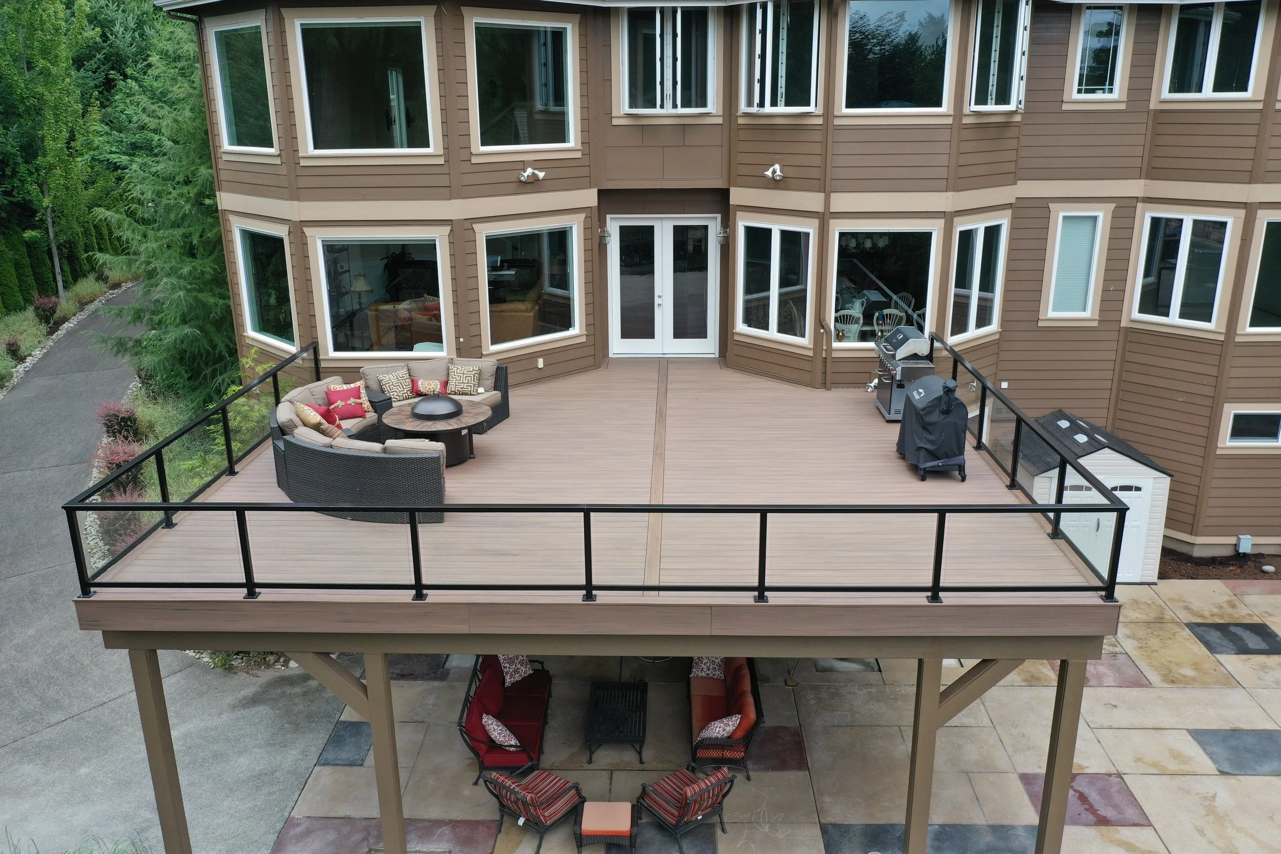 What a fantastic spot to take in the natural surroundings from the ground or the second story. A picture frame border seals the deal and is especially lovely on this Issaquah deck.