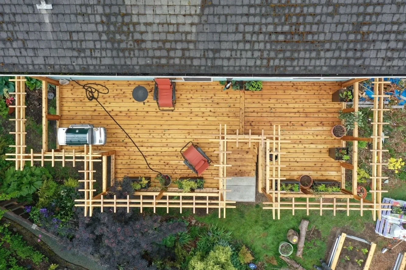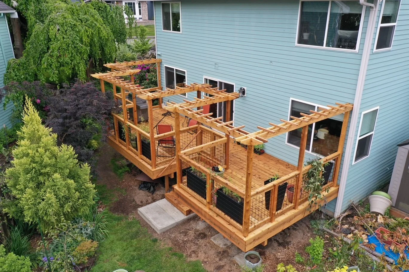 This cedar deck was intentionally designed to flawlessly support this client’s love for gardening. Arbors attached to every ‘hog wire’ railing will allow for vines to become a part of this lovely outdoor space.